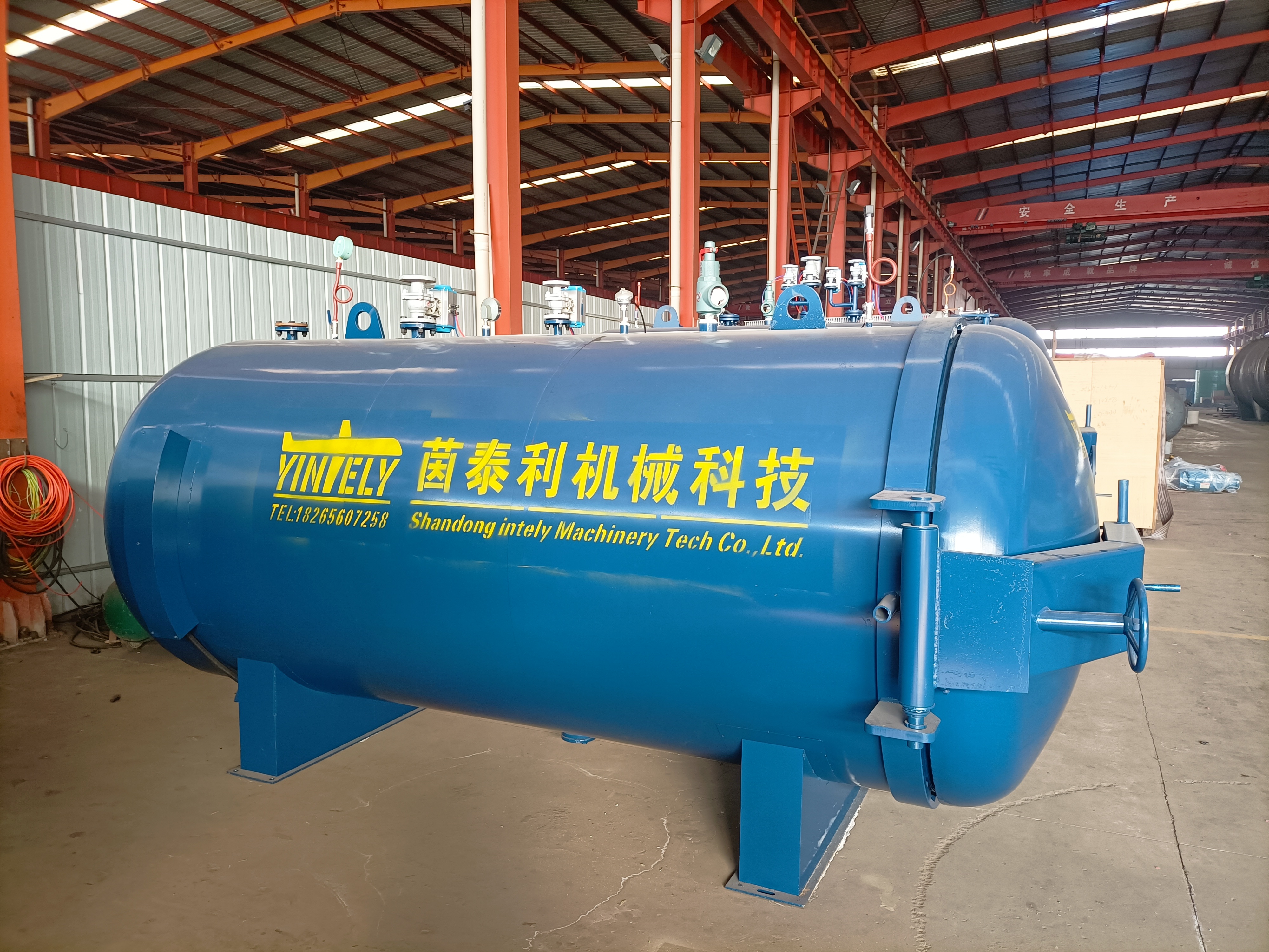 電干燒硫化罐內部采用的是不銹鋼電熱管進行加熱,發熱絲采用的是鎳鉻材料,鎳鉻電熱絲是與外接線路端子進行焊接,避免內置接線點發熱打火,性能安全可靠。電熱管功率一般為60千瓦,分三組開關進行單獨控制,達到所需工藝設定的溫度后只保留其中一組進行硫化保溫。采用一般采用風冷風機,將高溫空氣通過風道板在罐體內部來回中速循環,將熱量由前向后均勻擴散,保證罐內溫度均勻無死角,無冷氣團。設定所需要的工作程序后,控制系統自動進行升溫、保溫、硫化等工作,硫化結束后,報警器發出聲光報警提示音。本產品適用于膠管制品、膠輥制品等產品。系統裝配后,通入壓縮空氣使硫化罐內部氣壓升壓到一定數值,熱風循環系統開始工作,給電熱管升溫,隨著升溫升壓達到所需要的工藝參數后,溫控裝置使溫度和壓力自動保持在一定范圍,從而達到理想的硫化效果,保溫保壓結束后硫化完畢。硫化完畢后,如果需快速對制品進行降溫,罐內可設置循環水冷卻裝置,可使硫化物快速冷卻,達到工藝要求。電干燒硫化罐,采用溫度、壓力、時間自動控制的方式,比普通硫化罐節能百分之二十。