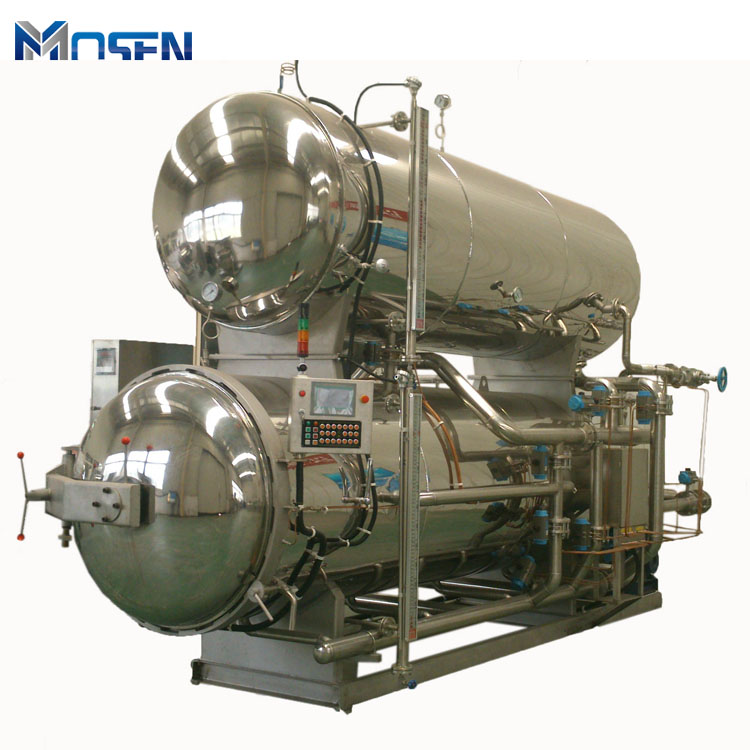 食品進入殺菌鍋內,山灌水進入到下罐,將冷氣團排出,完成食品浸泡,利用蒸汽加熱循環泵循環熱水,保證水循環的溫度誤差在正負5度左右.